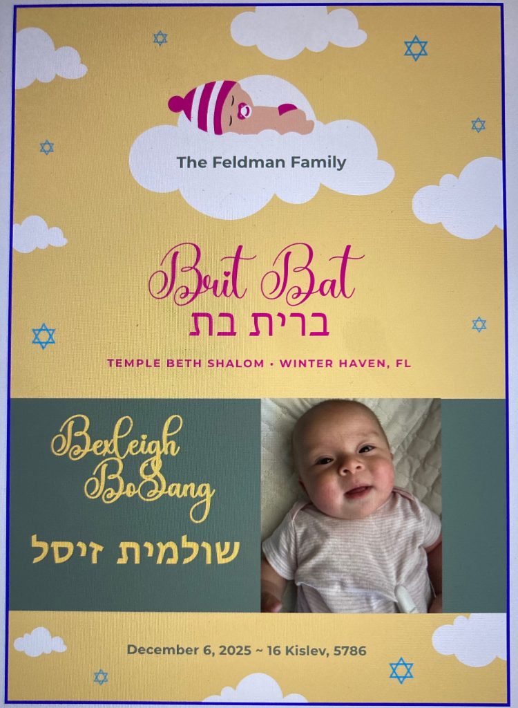 Hello Temple Beth Shalom Members and Friends, next time we meet is an especially joyous occasion! We will begin at 9:00 in the morning on Saturday, December 6 with Torah Study, which we have been enjoying. Following that and a brief break, at 10:15 am we are delighted to share in the naming of the Feldman family’s new infant daughter, granddaughter, and niece. We hope you will join Ethan and Ventura with their family in welcoming Bexleigh into our Jewish community. The morning’s activities will all be in our synagogue building and simultaneously available through the Zoom link, please contact us for the link.